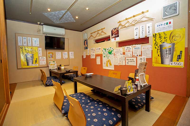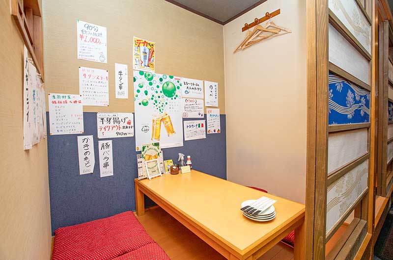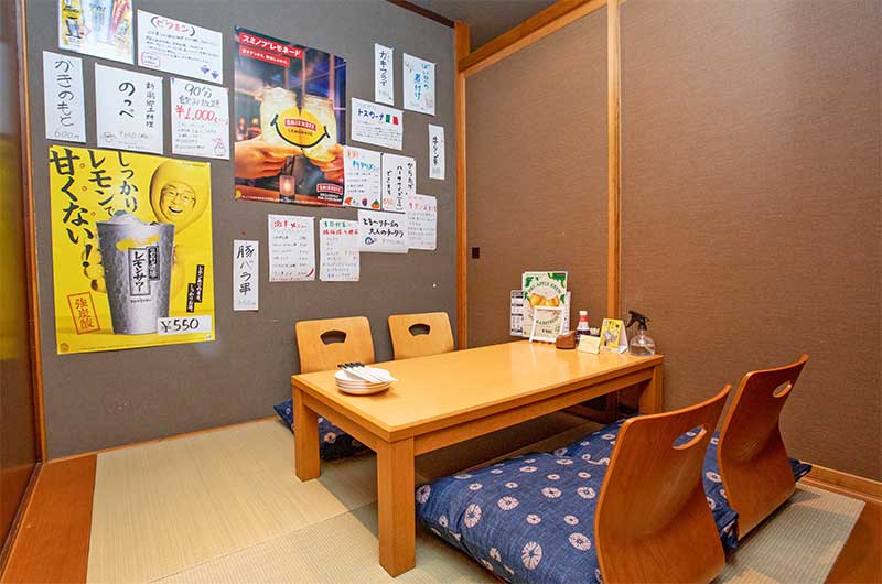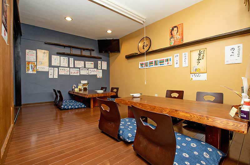 店内は広々としたつくりで、座敷席がメイン。無理に席を増設することなく、各テーブル間は十分な間隔を設けておりますので、密にならず、ご飲食をお楽しみ頂けます。お店は、アットホームな雰囲気で、家飲み感覚でお寛ぎ頂けます。お一人でのお酒やお食事も気兼ねなくどうぞ。おすすめの料理やお酒など、ぜひお気軽にご用命ください♪
